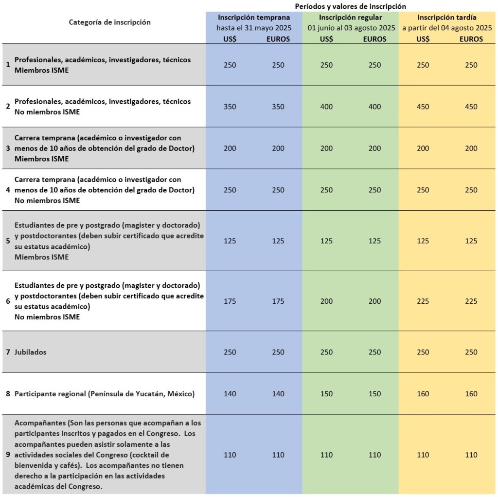 | 5 | Estudiantes de pre y postgrado (magister y doctorado) y postdoctorantes (deben subir certificado que acredite su estatus académico) Miembros ISME |